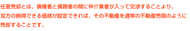 任意売却とは、債権者と債務者の間に仲介業者が入って交渉することより、双方の納得できる価格が設定できれば、その不動産を通常の不動産売買のように売却することです。